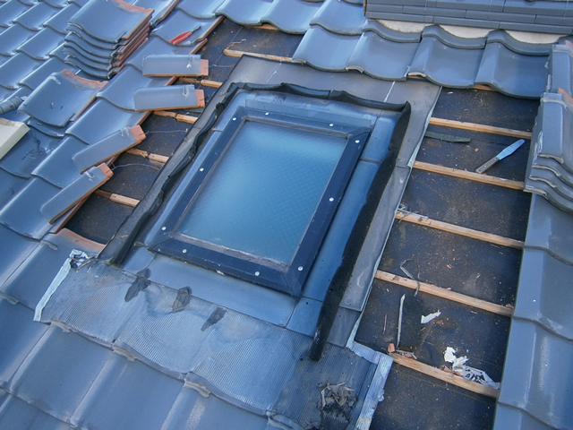 新しく差し込んだアルミ材等の部品と天窓の既存板金等を