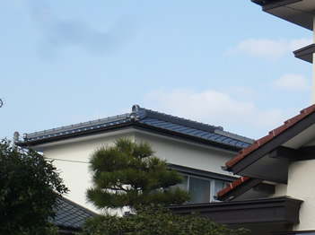 - 三州産(愛知県)の陶器瓦に交換されて、施主様のご希望で最上部にも鬼瓦を設置しました。すごく喜んで頂きました。