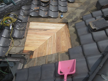 防水紙や瓦を引っかける木材を打ち直し、ステンレスの谷板金を入れて下準備万端です!